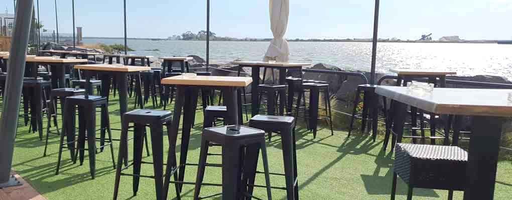 Table avec base centrale, base de 45cm de diamètre et colonne en tube d'aluminium de 6cm de diamètre.